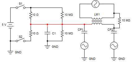 But what if we add a few more factors into the circuit? Let's assume R1 and R2 are huge -- in this case, 10 Mohm each. Let's also add mutual inductance, an additional resistive leakage path, and some parasitic capacitance to nearby active traces: